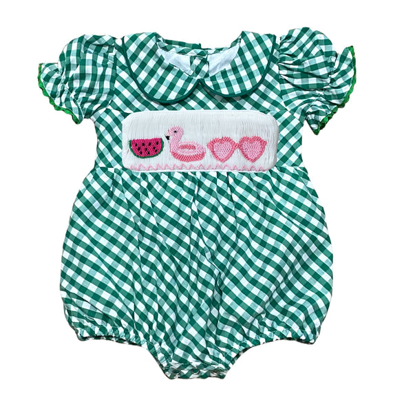 Green gingham bubble. Snaps in stride and at back for easy dressing.