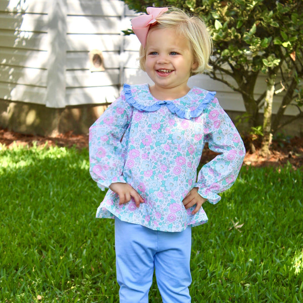 Floral shirt with Light Blue Pants. Shirt Fabric is Woven Cotton and Pants are knit. Matching sister bubble also available! See size chart in images for proper sizing.