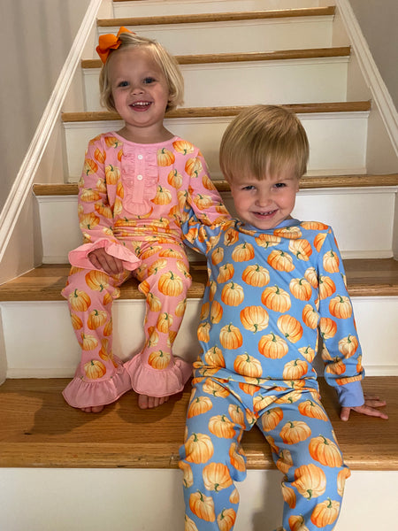 Blue Knit pajamas with orange pumpkins. Matching girl pajamas available. See size chart in images for proper sizing.